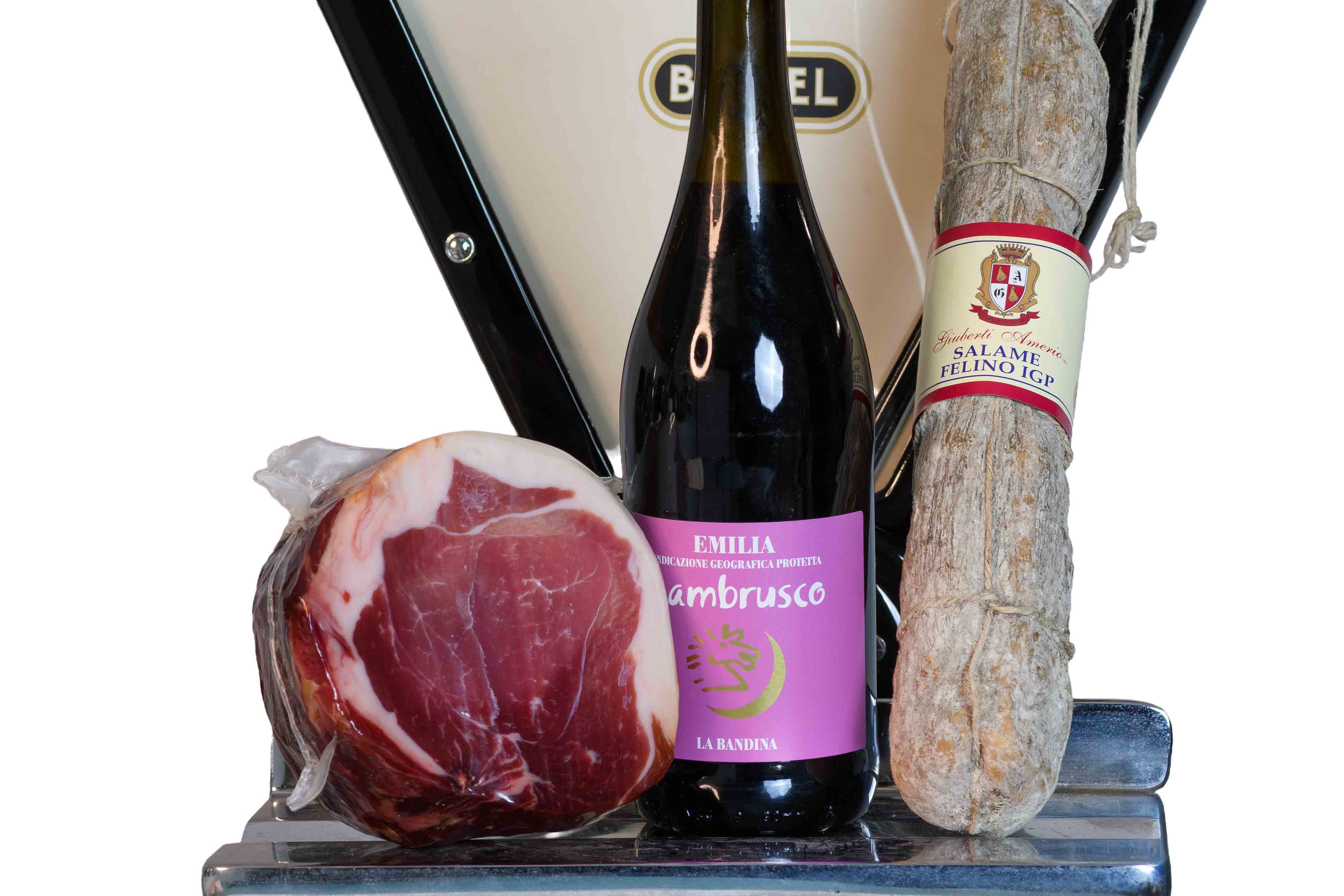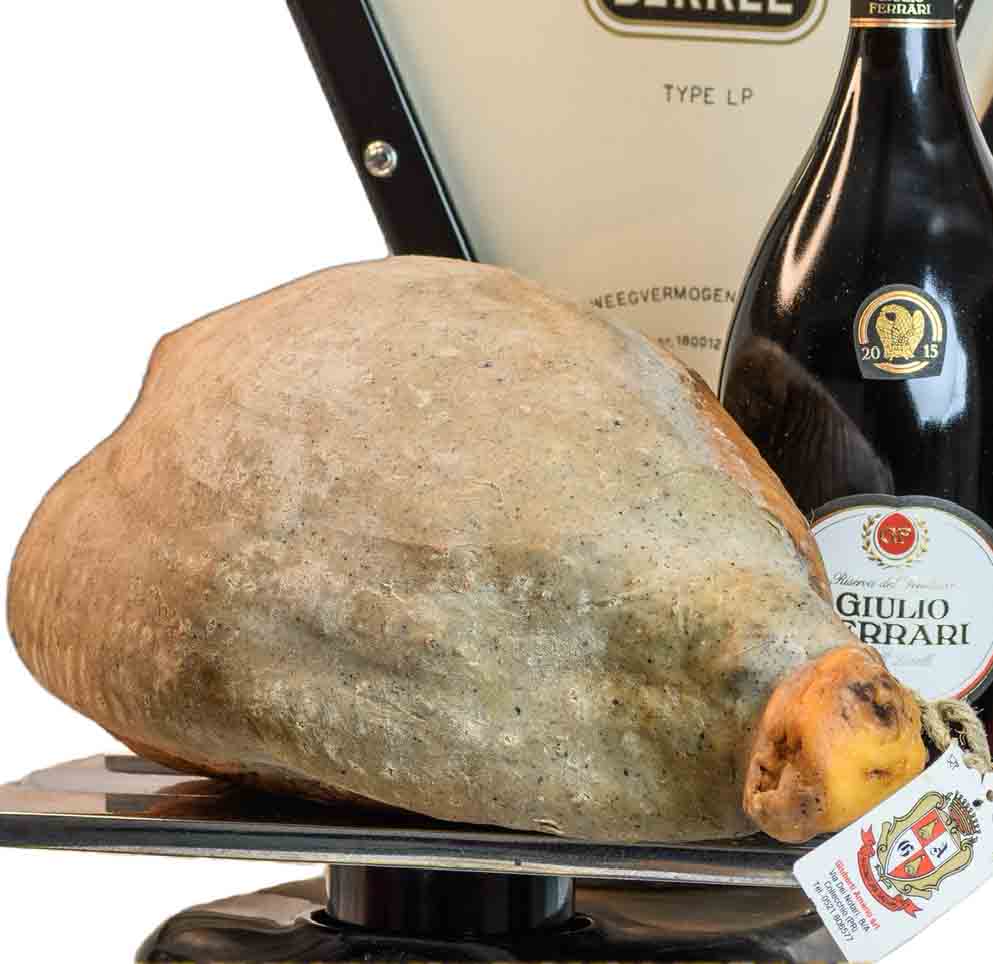 Culatta stagionata extra 30 mesi confezionata in metà sottovuoto 2,5 kg,1 Franciacorta Villa millesimato DOCG, 1 kg formaggio Parmigiano Reggiano 24mesi 1 Strolghino di culatello 0,300kg